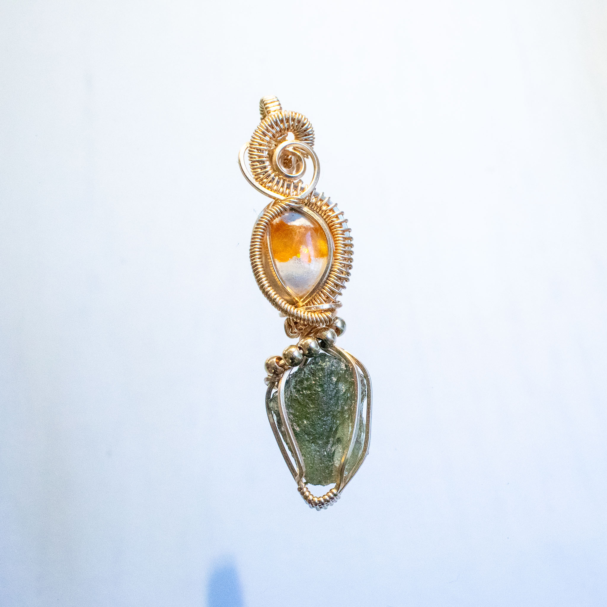 Moldavite and Mexican Fire Opal Gold pendant features Moldavite crystal found in Chlum, Czech Republic in 2023.Â