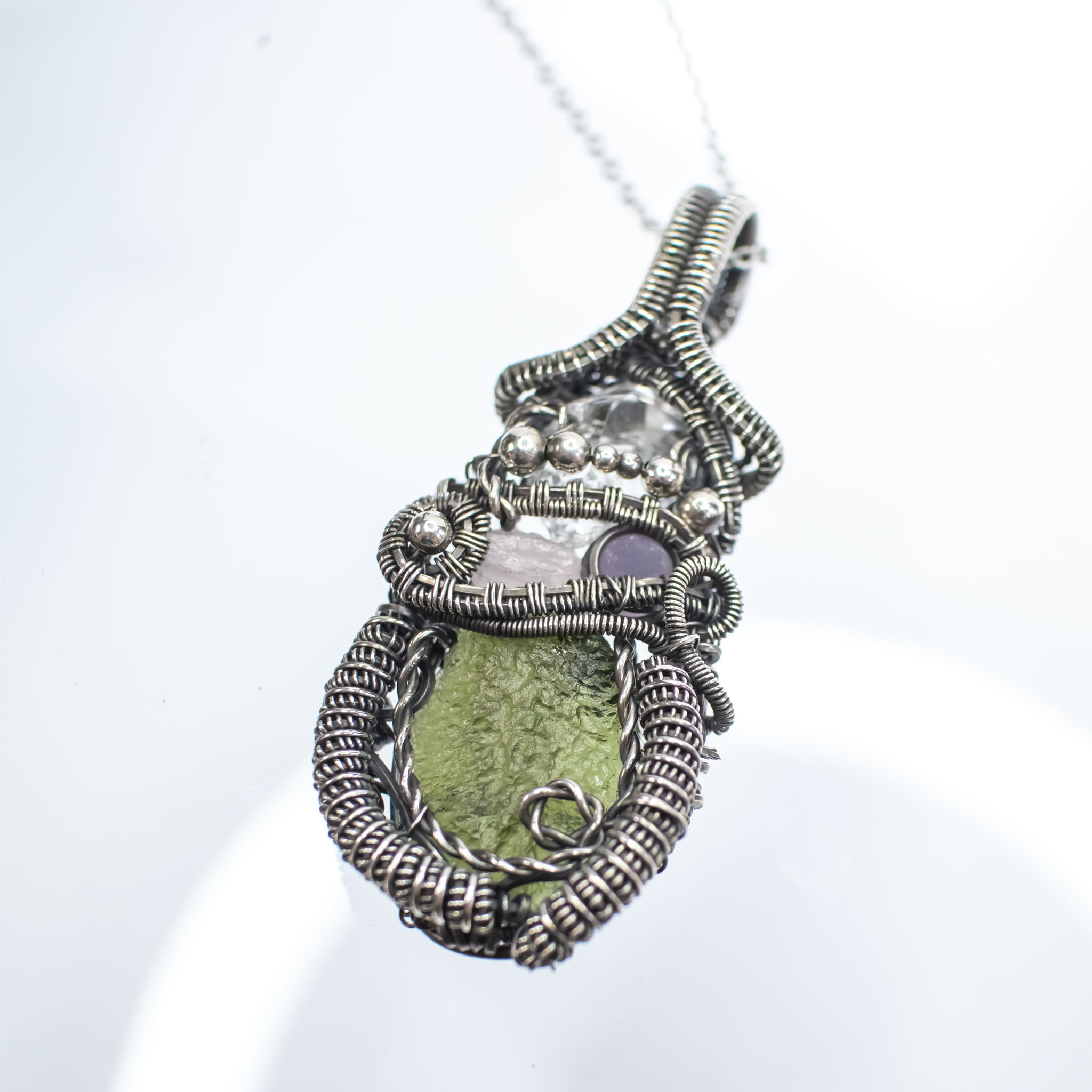 Moldavite, Herkimer Diamond, Grape Agate, and Rose Quartz silver wire-wrapped pendant future 4 raw natural crystals.