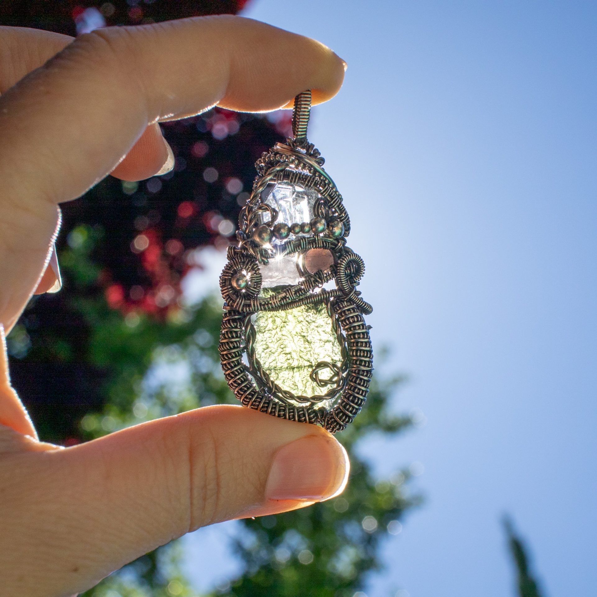 The moldavite pendant was wire wrapped in Sterling Silver and tarnished for a more Antique Look.