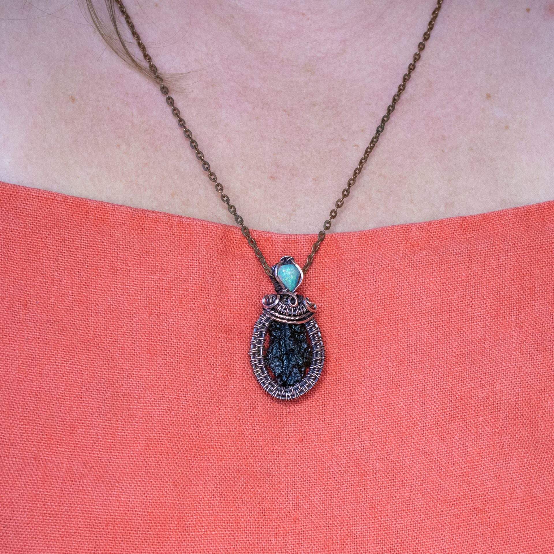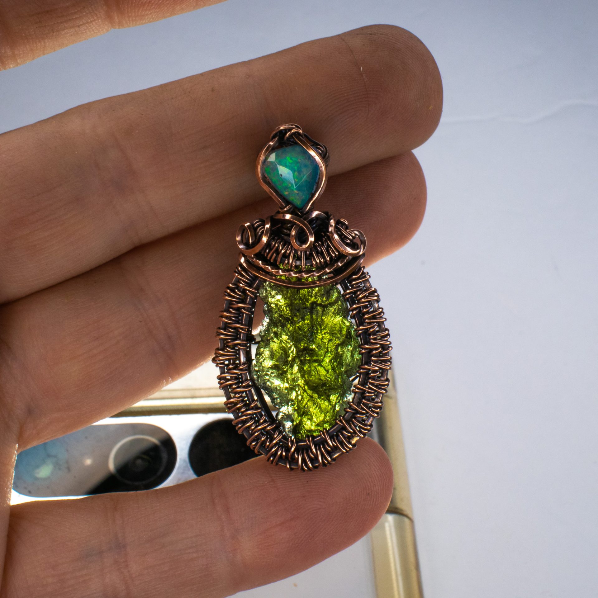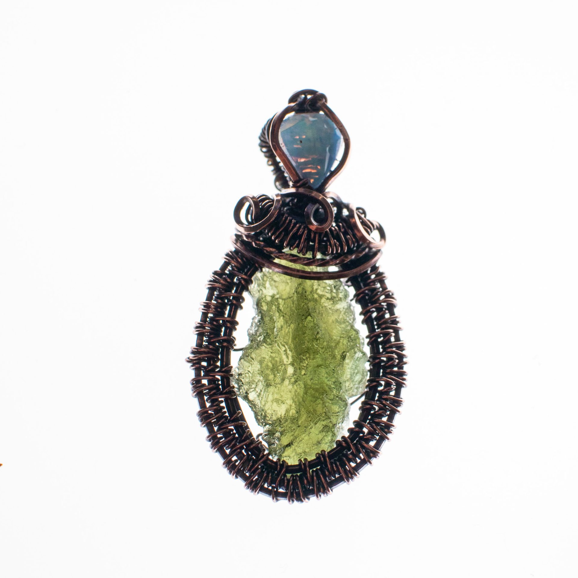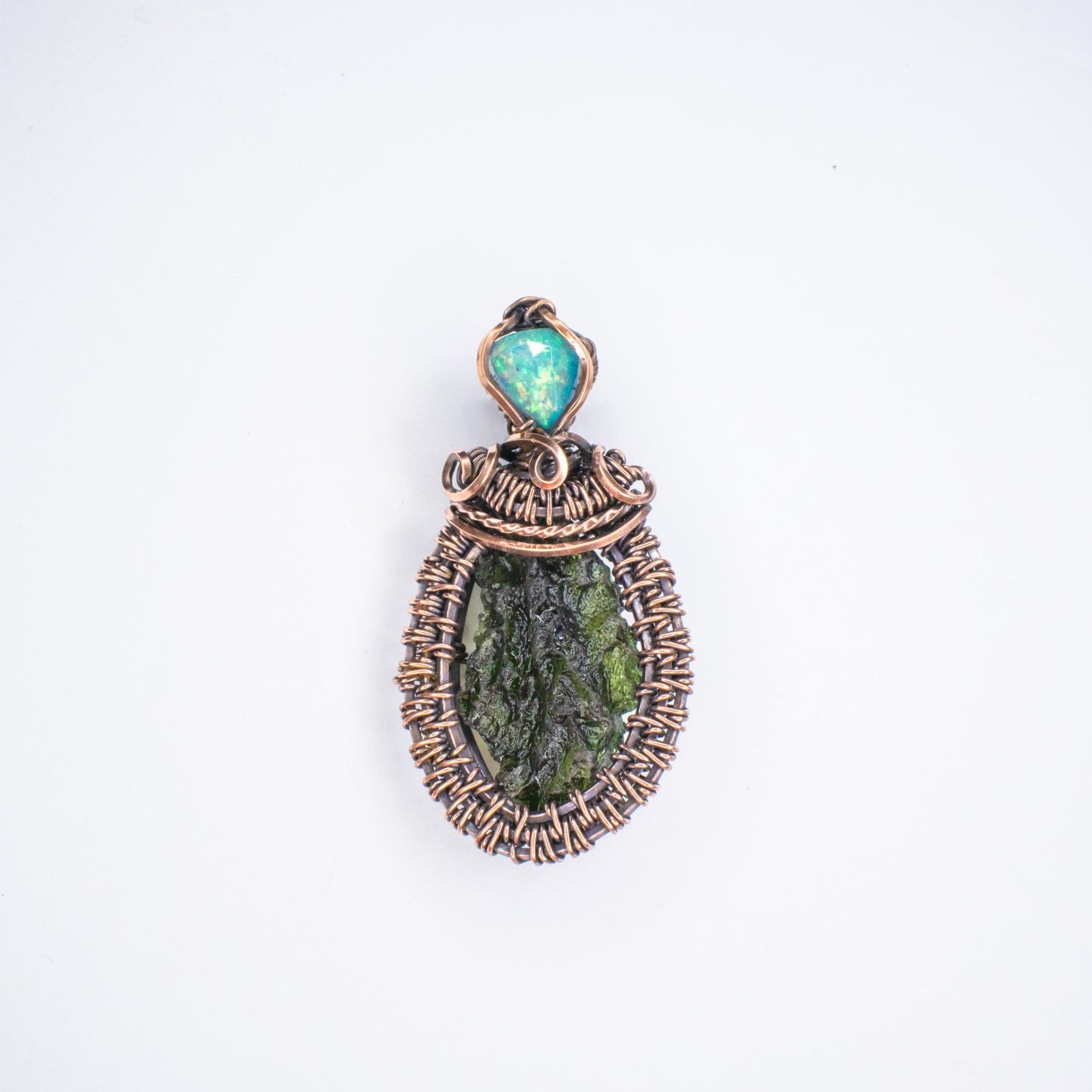 Moldavite pendant featured a MOLDAVITE crystal of 2.43 grams with Ethiopian natural opal wire wrapped by hand in pure copper.