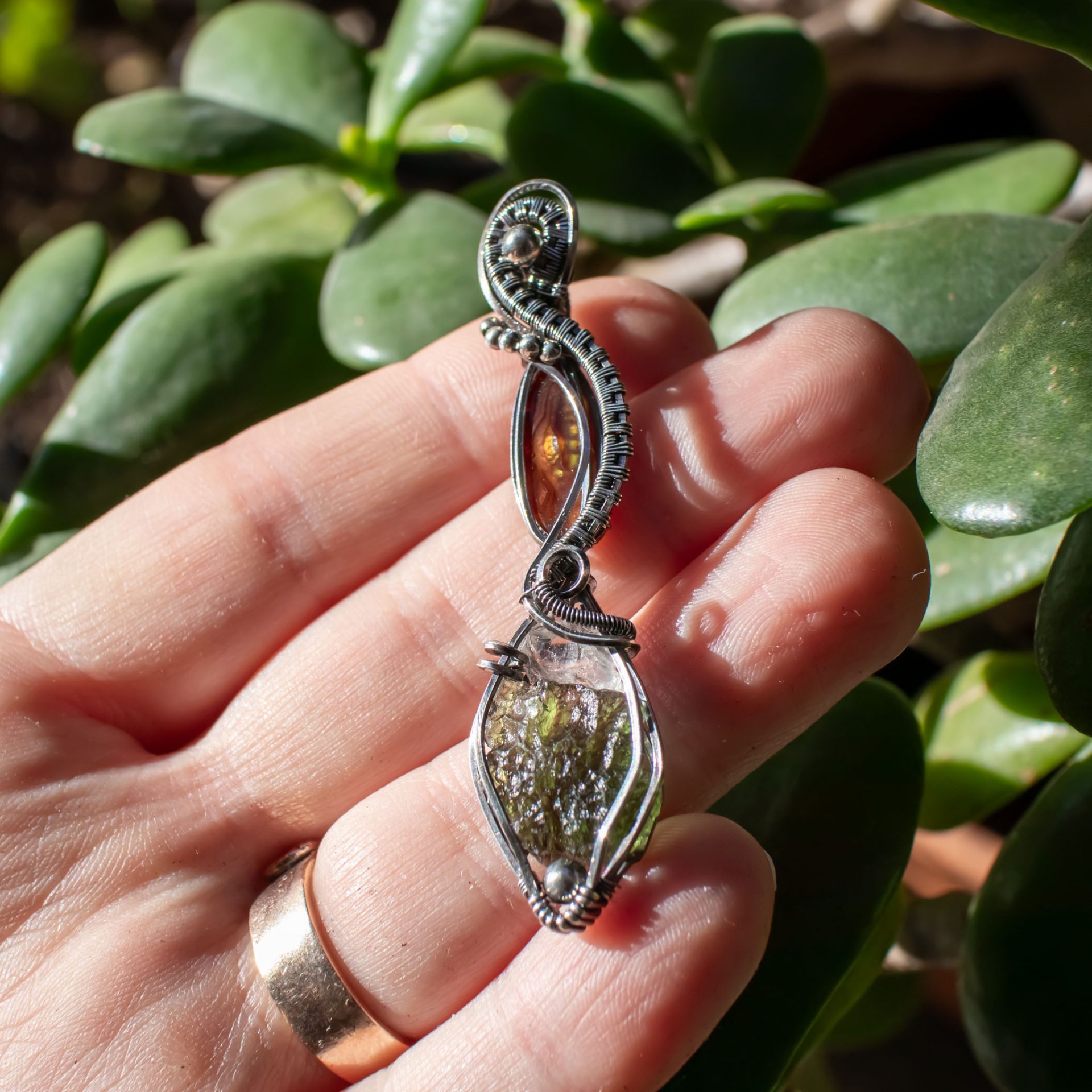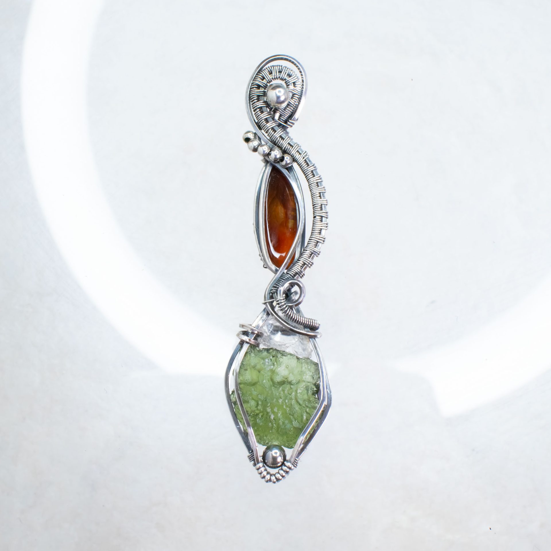 This Moldavite, Phenakite, Fire Agate Silver Pendant is the ultimate combo for spiritual transformation.