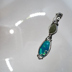 Natural Moldavite with Natural Ethiopian opal Blue ( dyed ) wire wrapped in Sterling Silver 925. Cometh with Sterling silver chain of 18 inches.