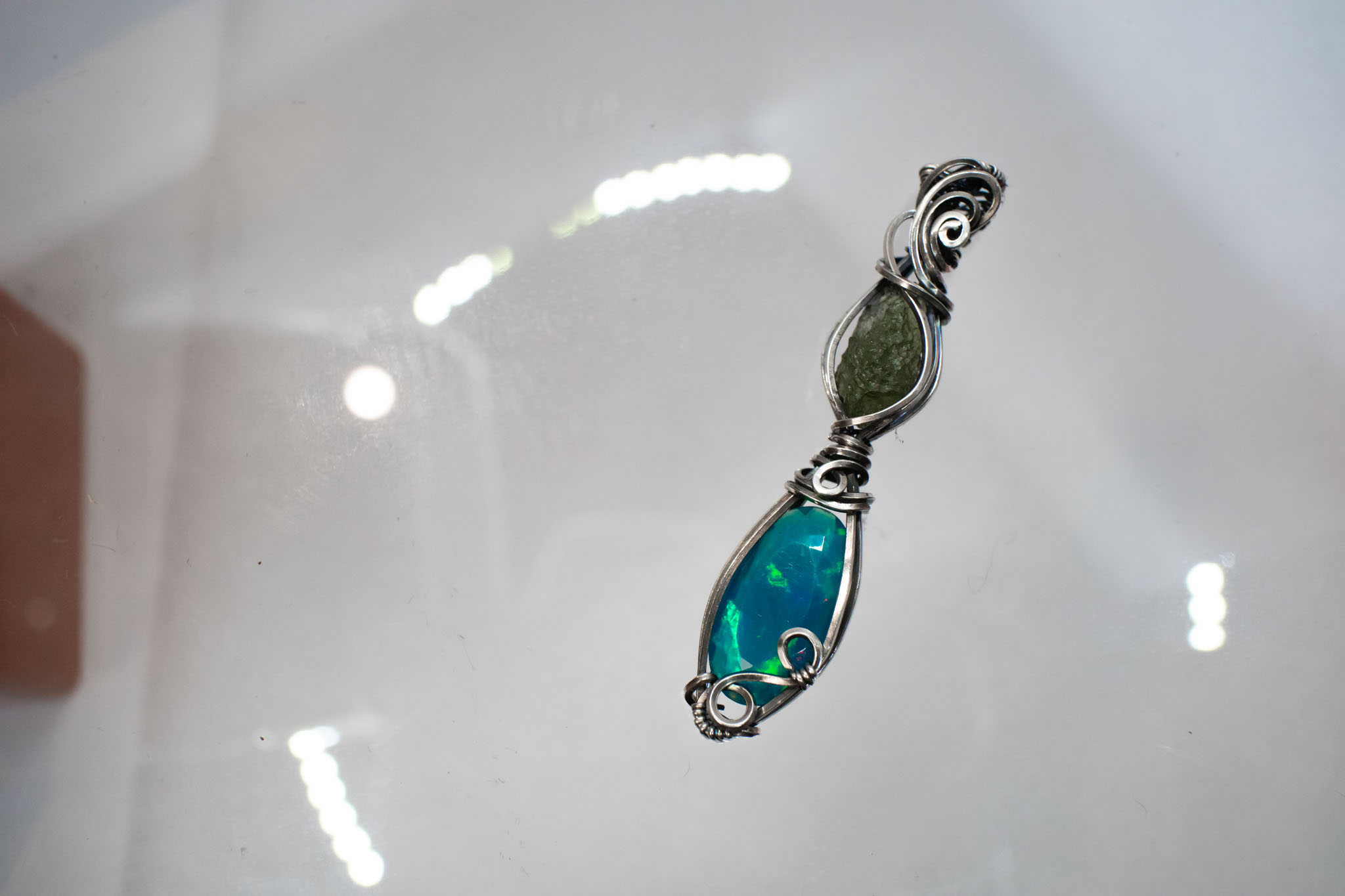 Keep your Moldavite and Opal pendant away from water, oils, and harsh chemicals. Gently clean with mild soap and a soft cloth—avoid ultrasonic or steam cleaners. Store in a dry jewelry box, away from sunlight and other pieces to prevent scratches.