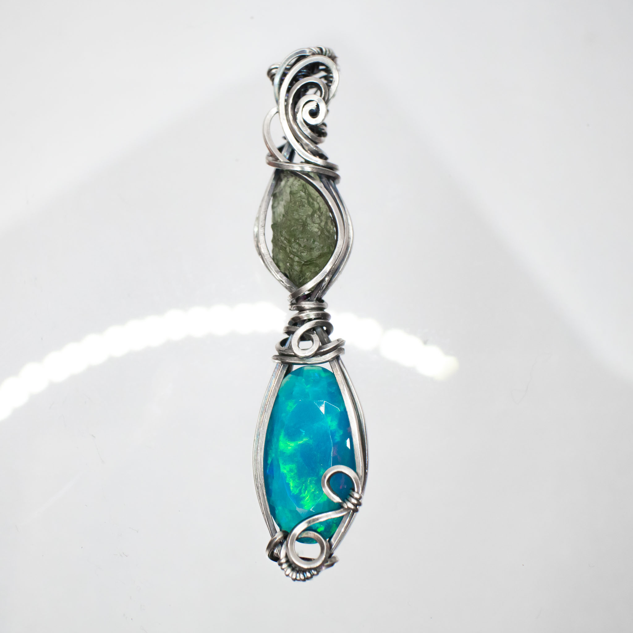 Moldavite with Fire Opal Silver Necklace is a radiant union of transformation and cosmic beauty. Moldavite’s powerful vibration opens the heart and accelerates spiritual growth, guiding you through deep self-discovery and life transformation. Paired with Ethiopian Opal from the Welo mines, this pendant shimmers with ethereal blues that ignite creativity and emotional healing. The Opal’s mesmerizing play of color mirrors the shifting light of your soul’s journey, while Moldavite channels divine energy to the places in your life that need it most. A perfect piece for anyone ready to embrace change, awaken intuition, and align with their higher purpose.