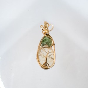 Moldavite with Libyan Desert Glass Gold pendant features a Moldavite crystal found in Chlum, Czech Republic in 2025.