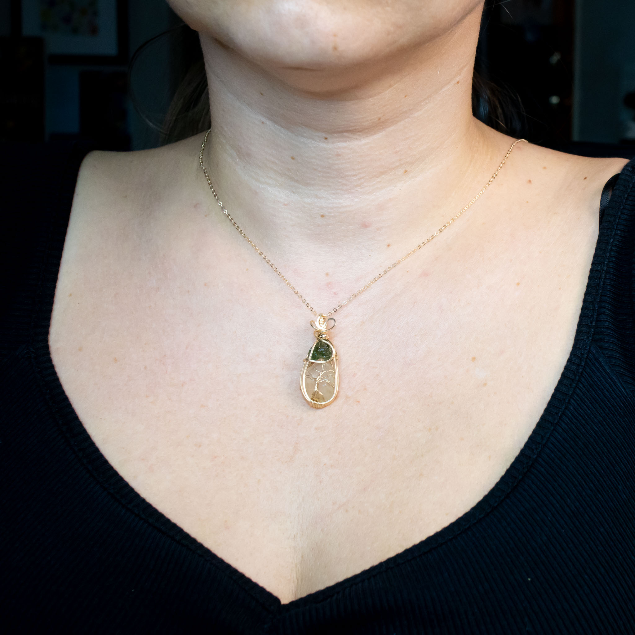 The pendant features a rough Moldavite crystal of around 0.5 grams.