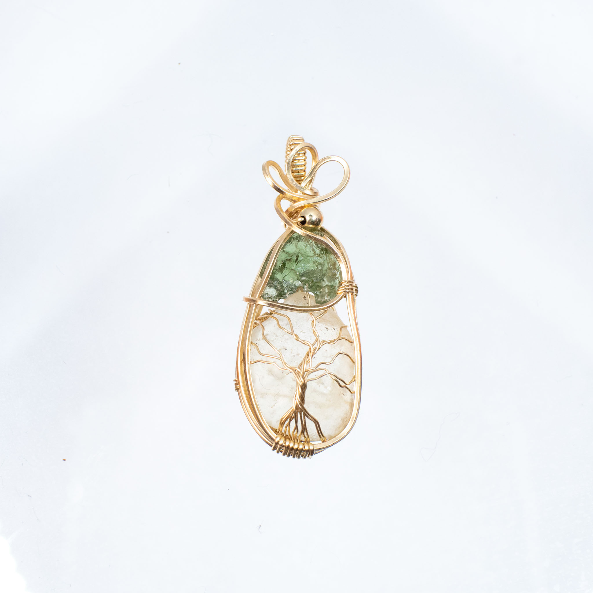 Moldavite with Libyan Desert Glass Gold pendant features a Moldavite crystal found in Chlum, Czech Republic in 2025.